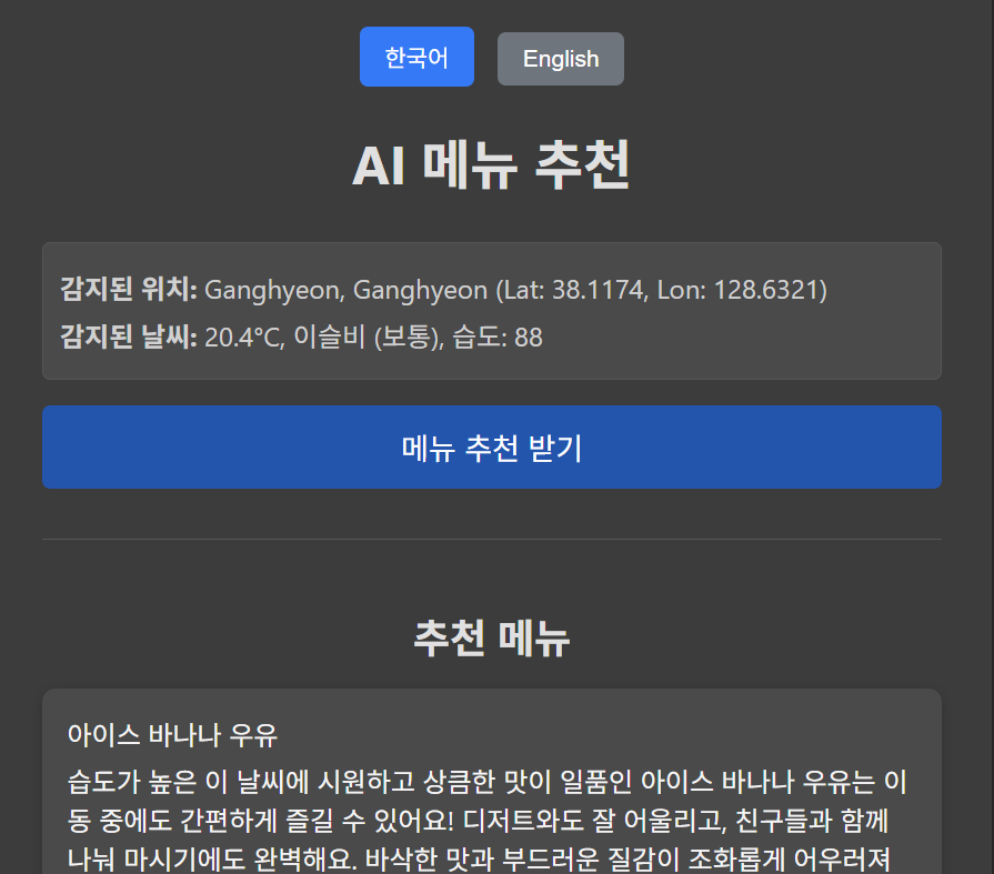 AI 기반 위치별 맛집 추천 시스템으로, 사용자의 현재 위치와 날씨 정보를 기반으로 맞춤형 음식 및 음료를 추천하는 Django REST API 서버입니다.